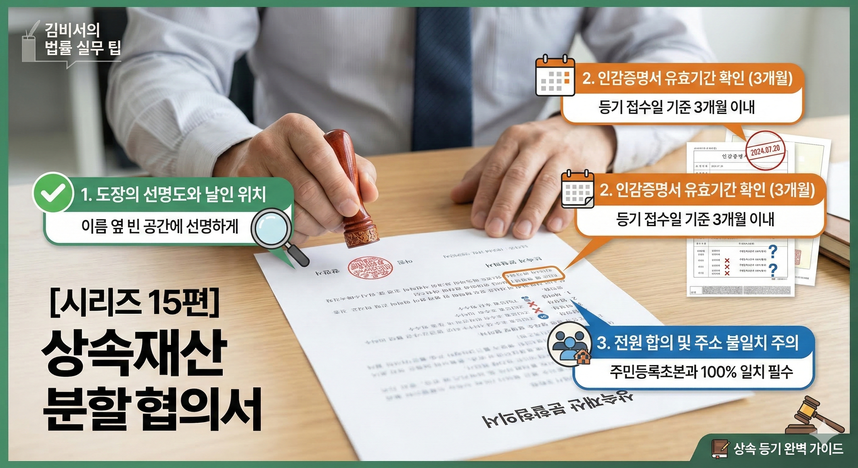#상속재산분할협의서 #상속등기서류 #인감도장주의사항 #법무사실무가이드 #부동산상속절차 #인감증명서유효기간 #상속인전원합의 #등기보정방지 #김비서의 법률팁